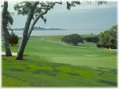 Hole Number 14, par 5, 548 yards. This is a long dog-leg right. A line of tall pines along the right side prevents any attempt at cutting the corner of the dog leg. A moderate wind was in our face but because the hole is some distance away from the ocean it seemed to not be blowing as hard. The caddy said this hole was so long that not even Tiger Woods could reach it in two.