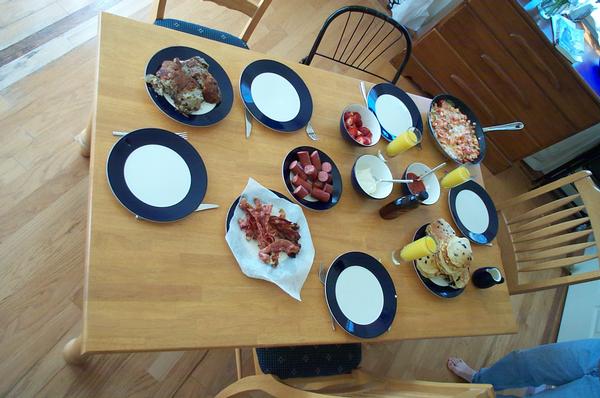 Breakfast: Pancakes, eggs, bacon, hash browns, strawberries, and KIELBASA!